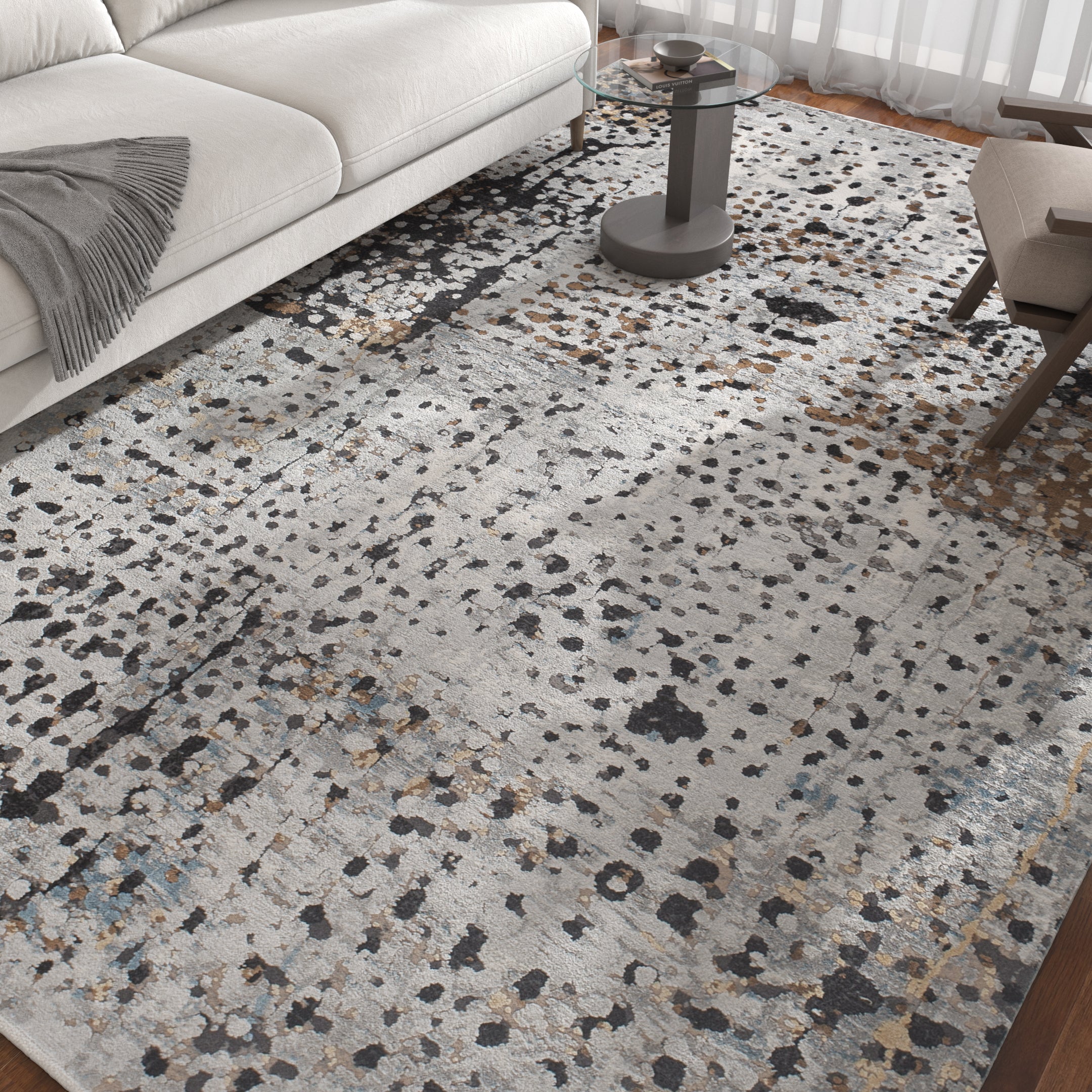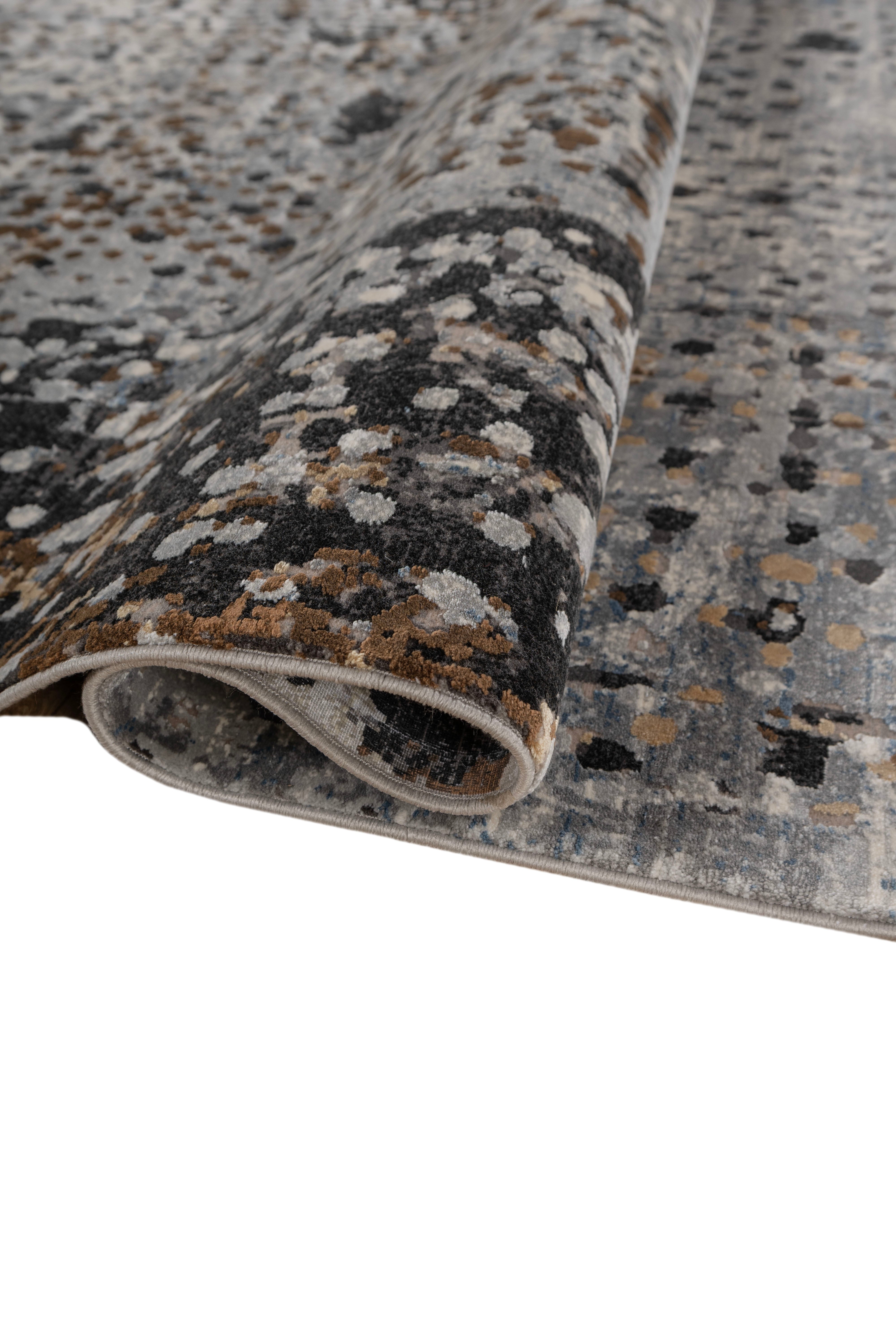 Color Palette:Gray meets inky blue in an abstract design that feels grounded yet dynamic. Its movement and depth give the room quiet confidence without overwhelming the space.