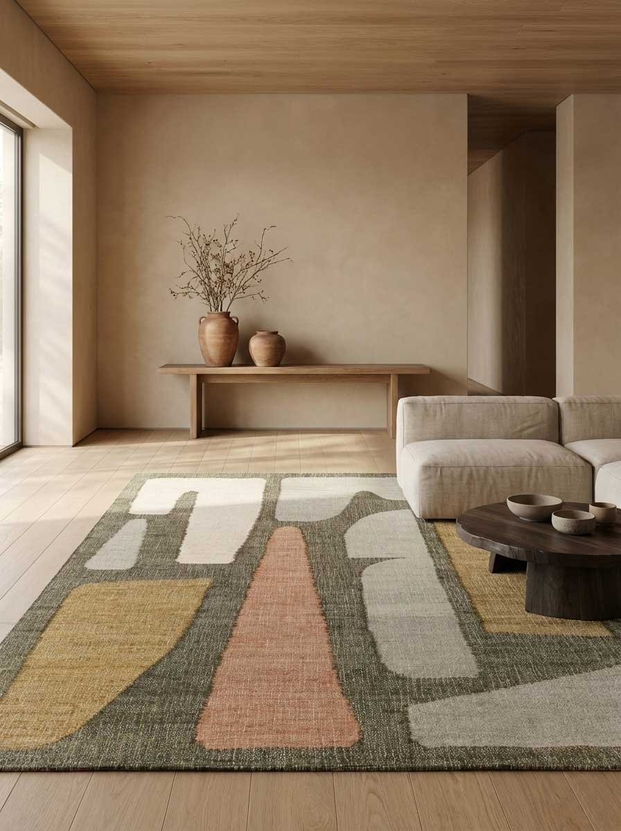 Color Palette:Inspired by classic artistry, this rug in forever Tan and Treetop balances warmth and contrast, grounding a room with quiet elegance.