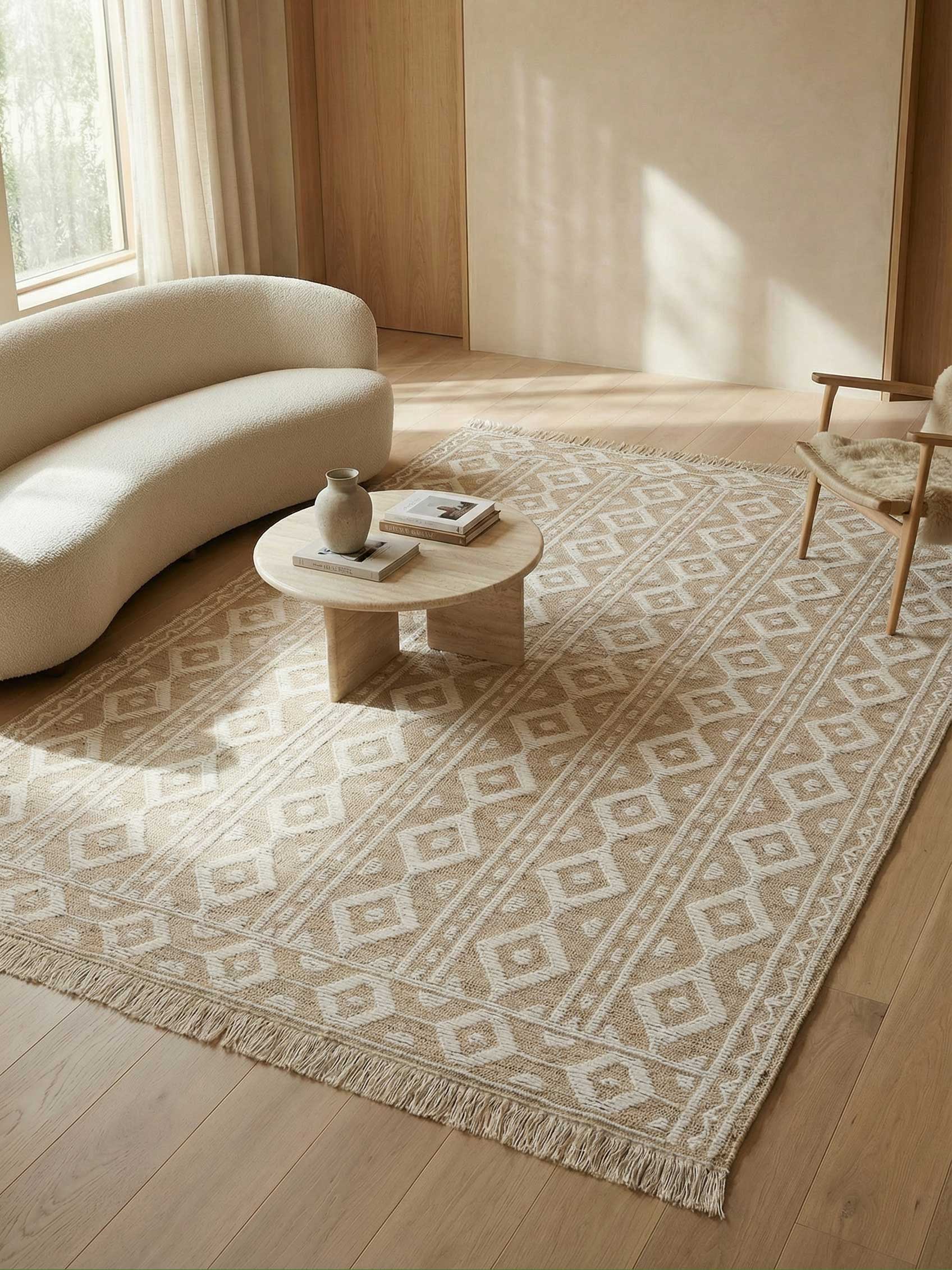 Color Palette:Inspired by classic artistry, this rug in forever Tan and White balances warmth and contrast, grounding a room with quiet elegance.