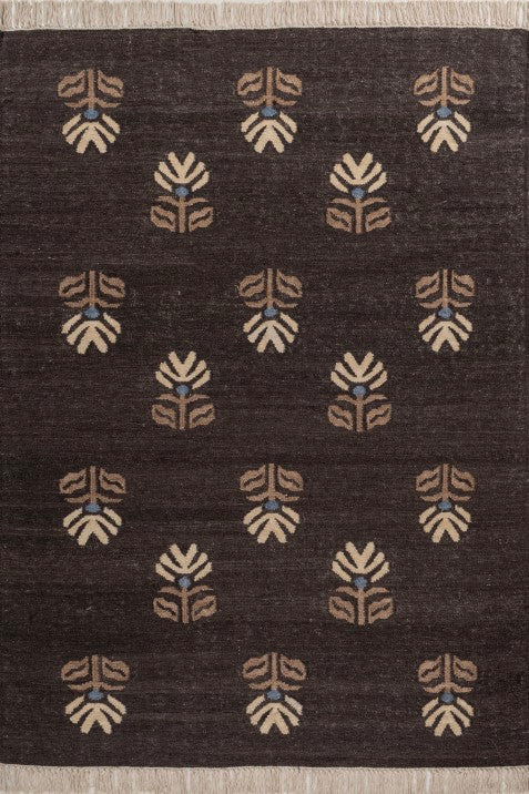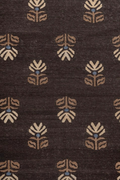 This wool dhurrie rug features a patterned area rug design with repeating botanical-inspired motifs set against a deep dark brown base. The modern Indian rug style blends subtle artisanal detailing with a clean layout, making it suitable as a living room dhurrie or accent rug. Crafted as a natural wool rug, it offers a durable flat weave carpet structure with a soft, grounded feel underfoot.