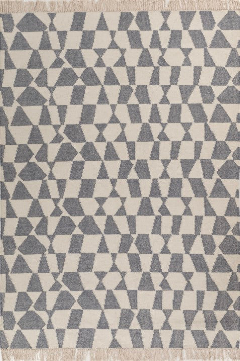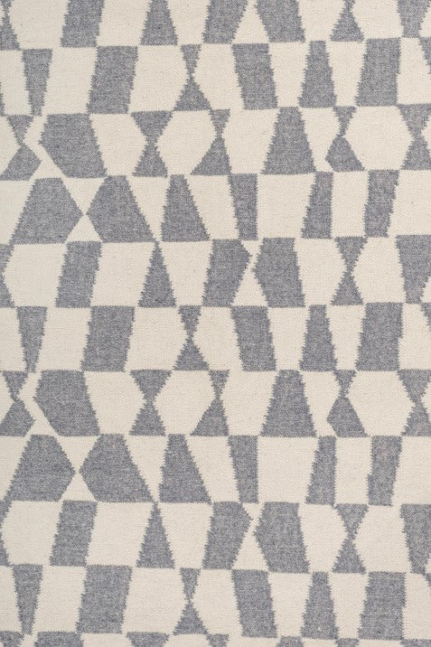 - Grey and white rug featuring a dynamic geometric pattern.
